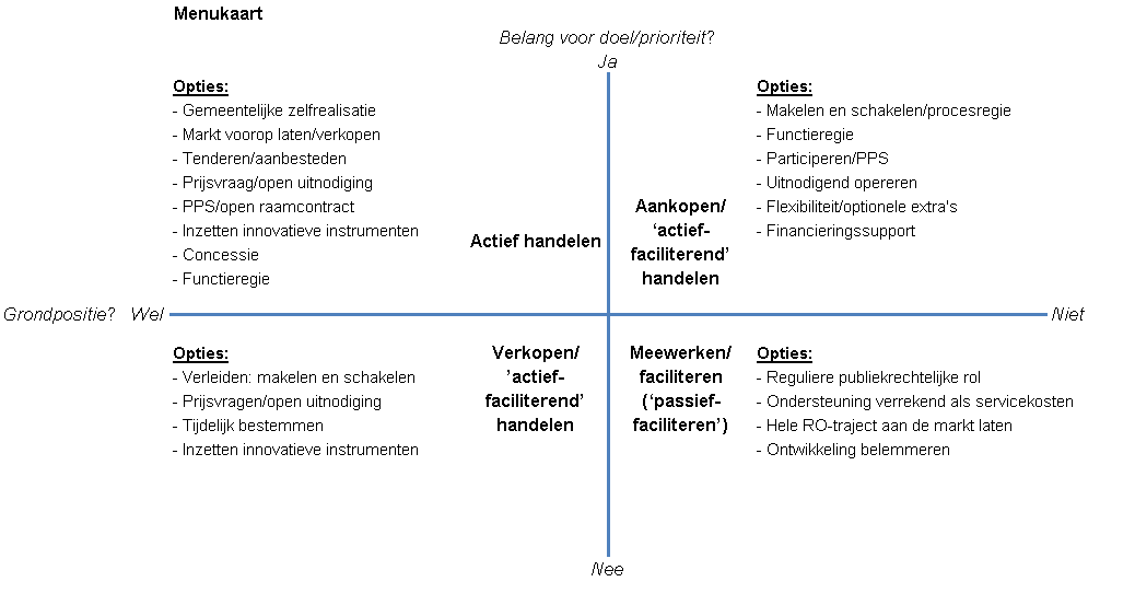 (De figuur geeft een schematische weergave van de 4 typen grondbeleid en de mogelijke opties waarop de gemeente het betreffende type grondbeleid kan uitvoeren)